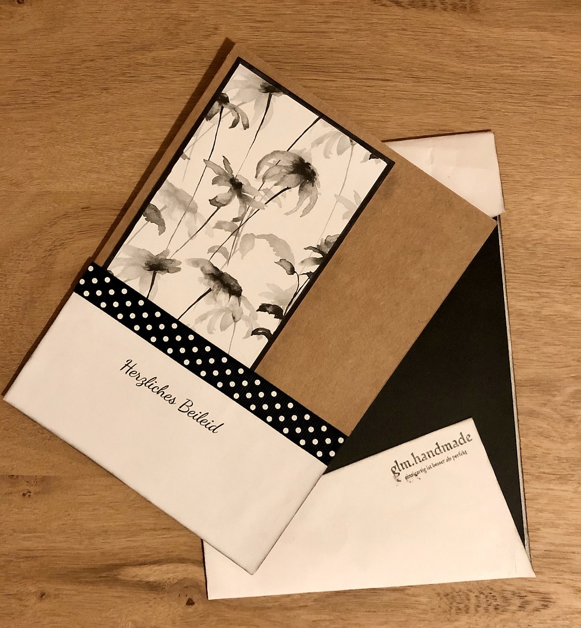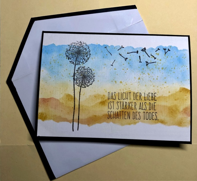 Das war meine allererste Trauerkarte mit dazugehörigem Umschlag. Sie gefällt mir heute noch genauso wie damals, als ich sie erstellt habe. Zu dem Zeitpunkt hatte ich noch nicht die richtige Papiergröße, für einen passenden Umschlag. So musste einfach improvisiert werden – und darin bin ich wirklich spitze. … hihhi …