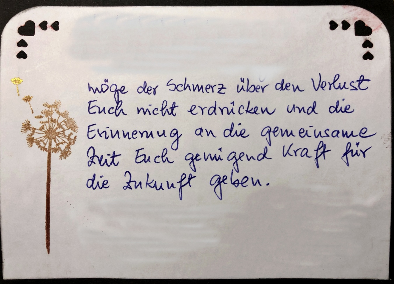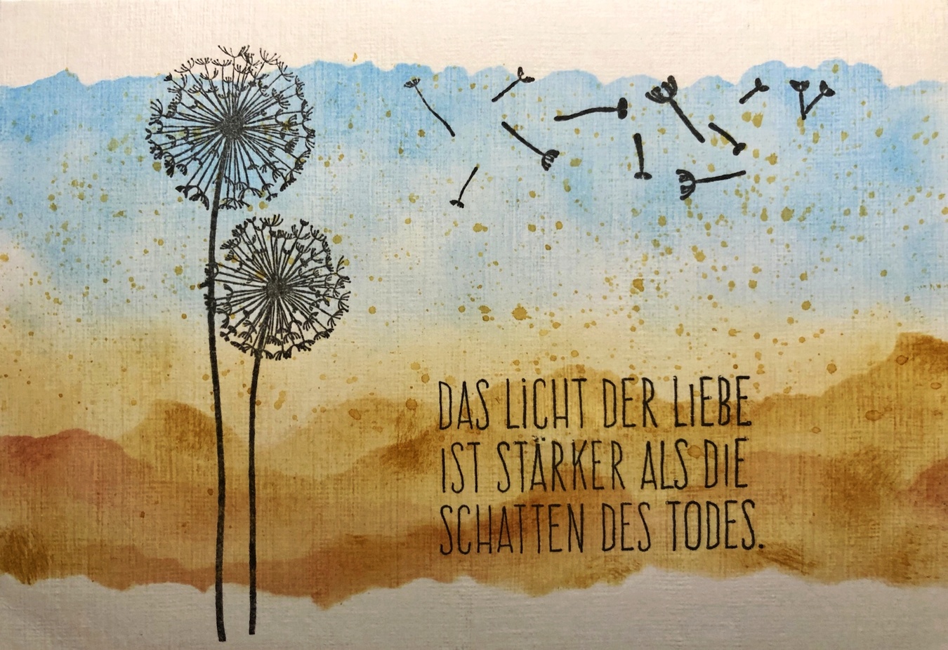 Ich glaube, das war meine zweite Beileidskarte. Es muss nicht immer nur schwarz sein! Bei einem unserer Mutter-Sohn-Gespräche kamen wir auch auf die Trauer zu sprechen. Da sagte er mir zu diesem Thema: Man trauert doch nicht mit einer Farbe, sondern tief im Herzen. Durch ihn inspiriert habe ich es so umgesetzt.