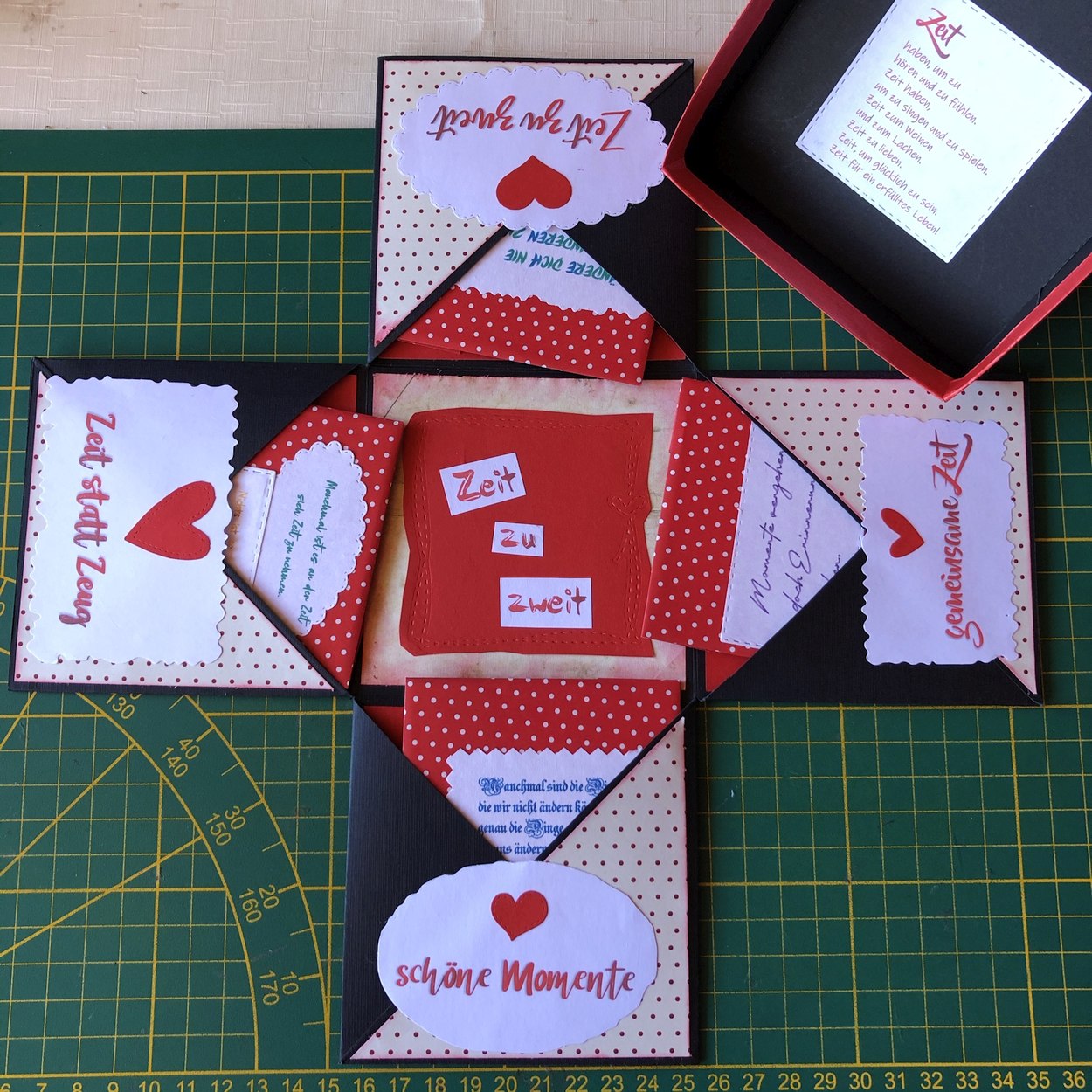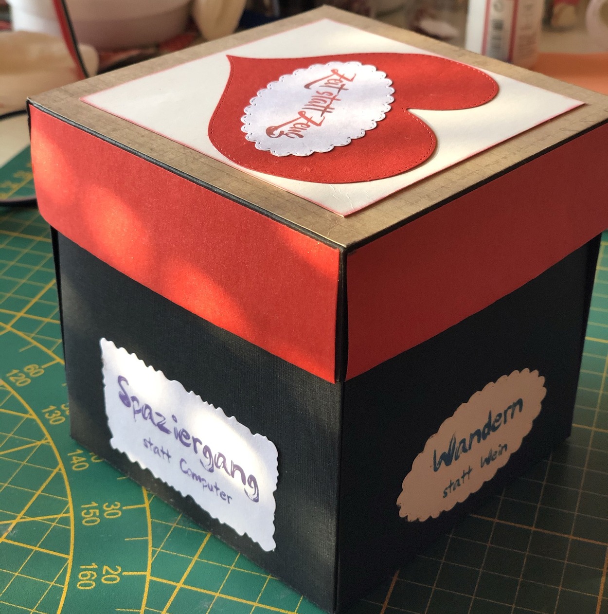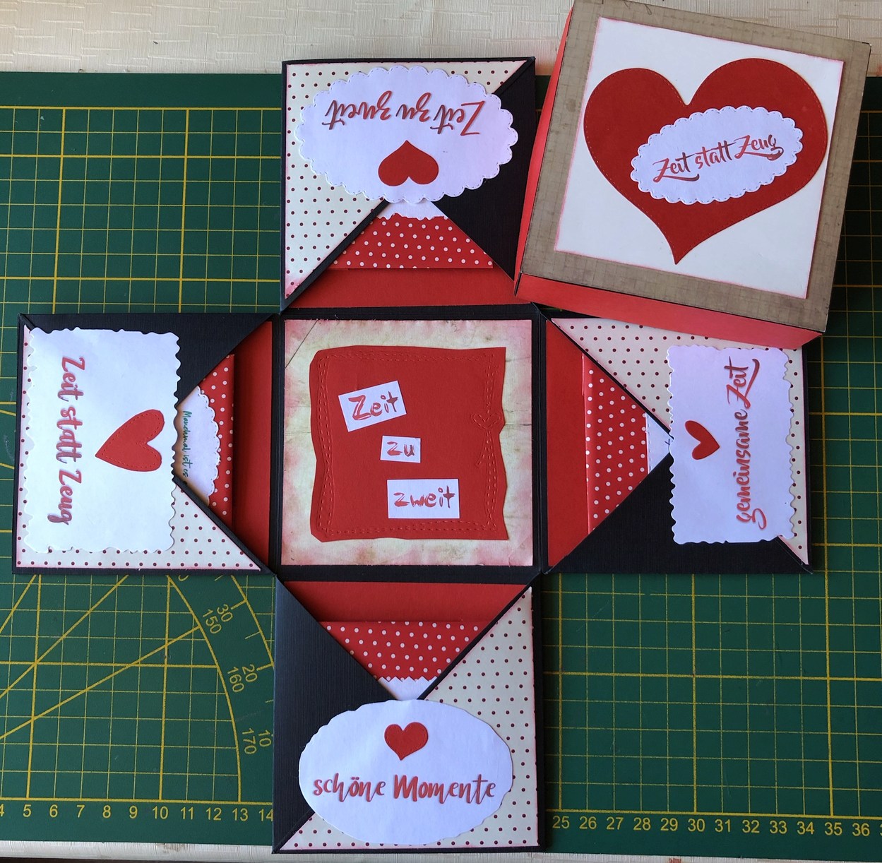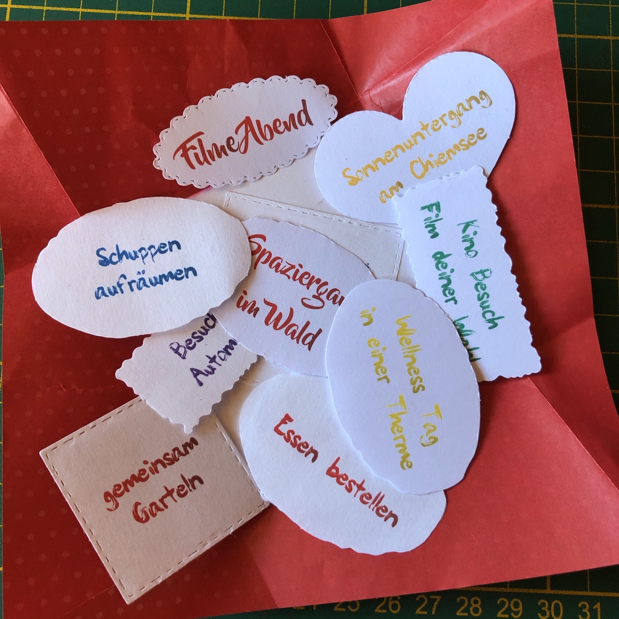 Dazu gehört nicht viel. Karton, Papier, Drucker und ein paar Stanzformen oder man schneidet die „gemeinsam verbrachte Zeit Momente“ einfach mit einer Schere aus. Daraus entsteht mit ein bisschen Fantasie und einer Prise Geschicklichkeit die „Zeit statt Zeug“ Box.
