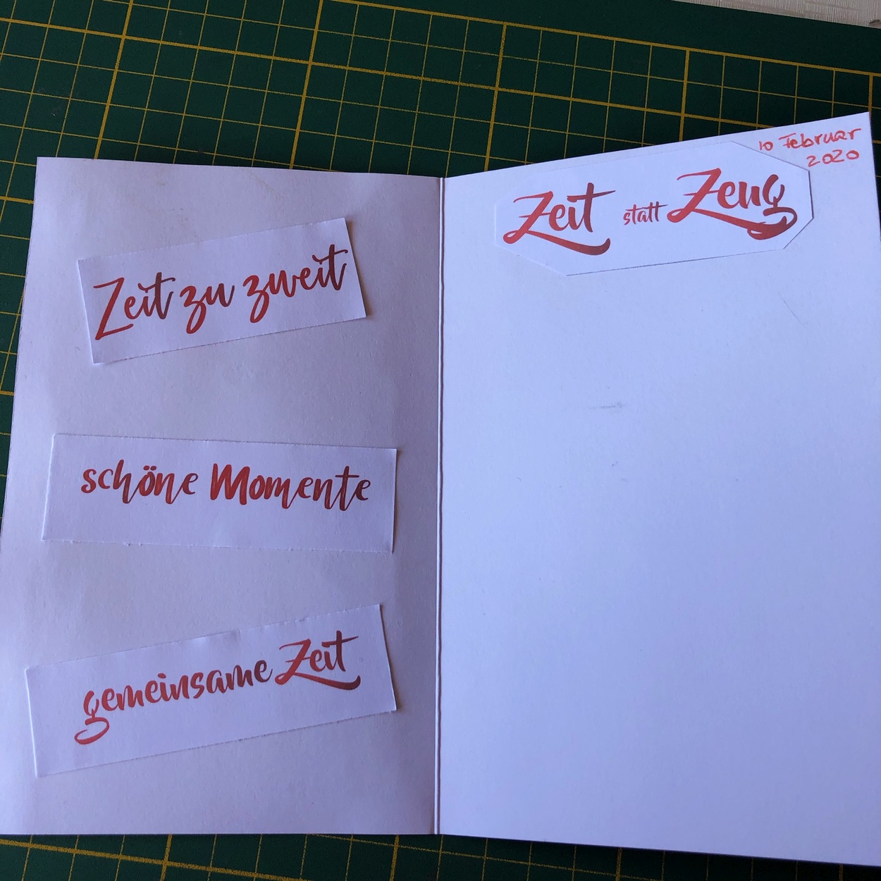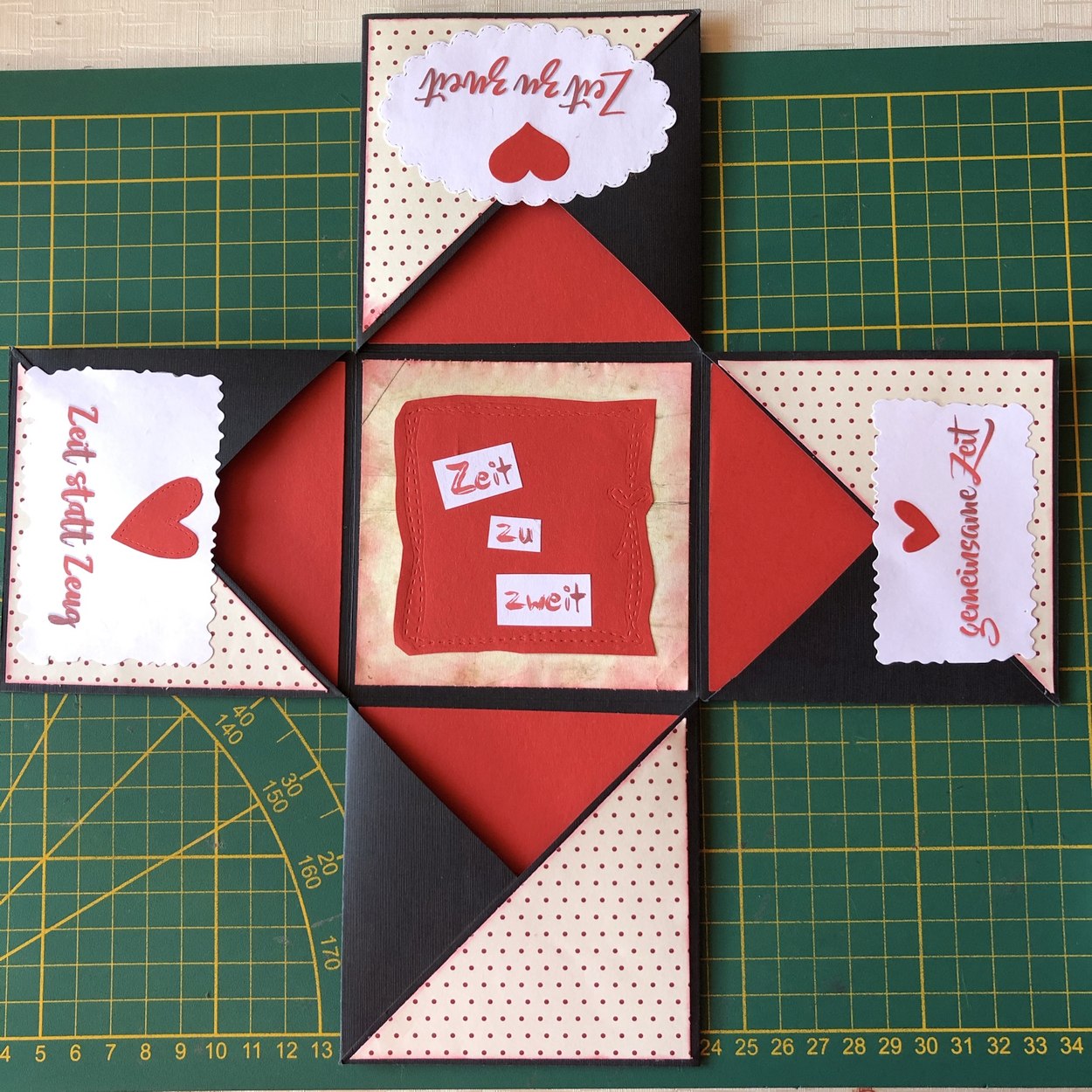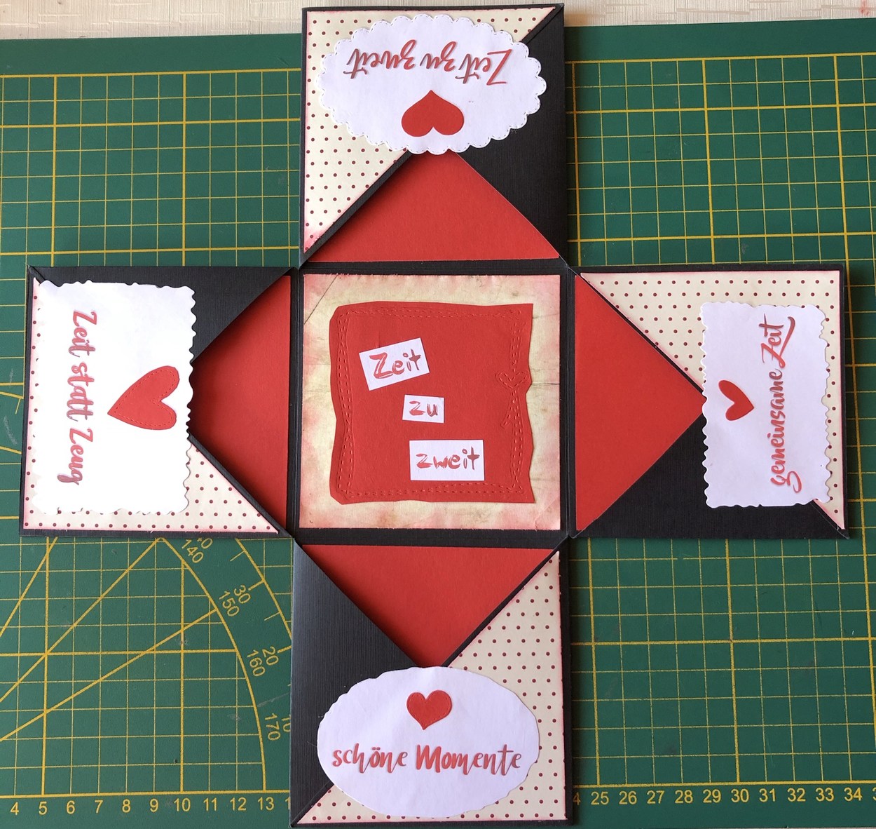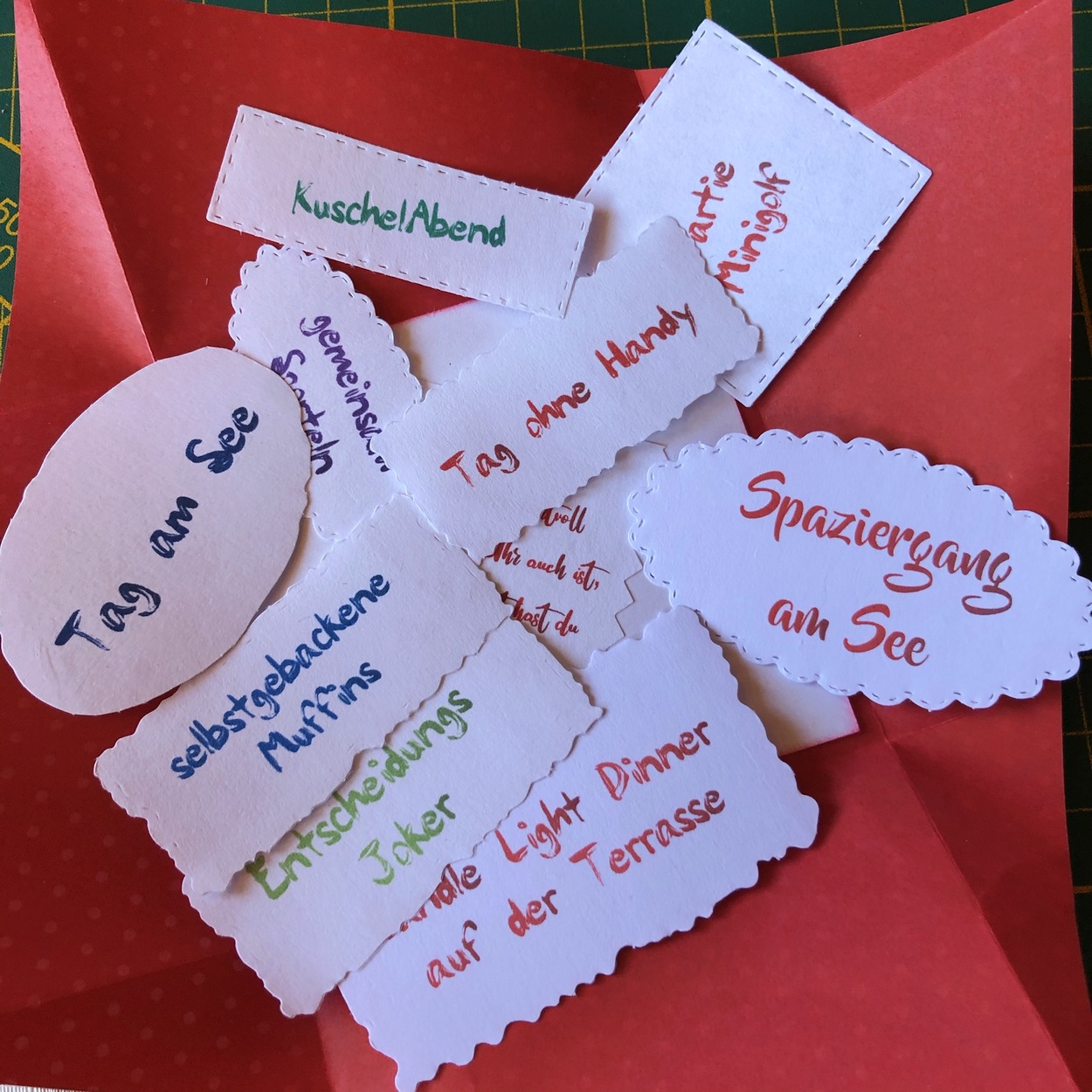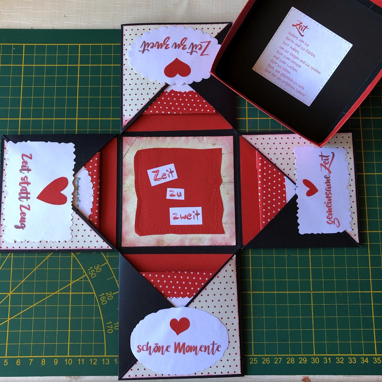 Dazu gehört nicht viel. Karton, Papier, Drucker und ein paar Stanzformen oder man schneidet die „gemeinsam verbrachte Zeit Momente“ einfach mit einer Schere aus. Daraus entsteht mit ein bisschen Fantasie und einer Prise Geschicklichkeit die „Zeit statt Zeug“ Box.