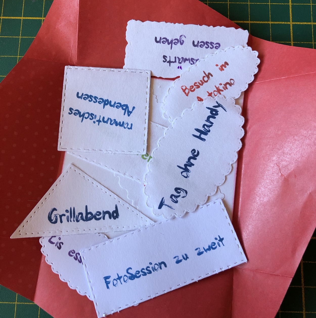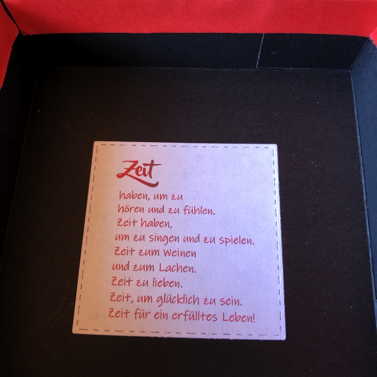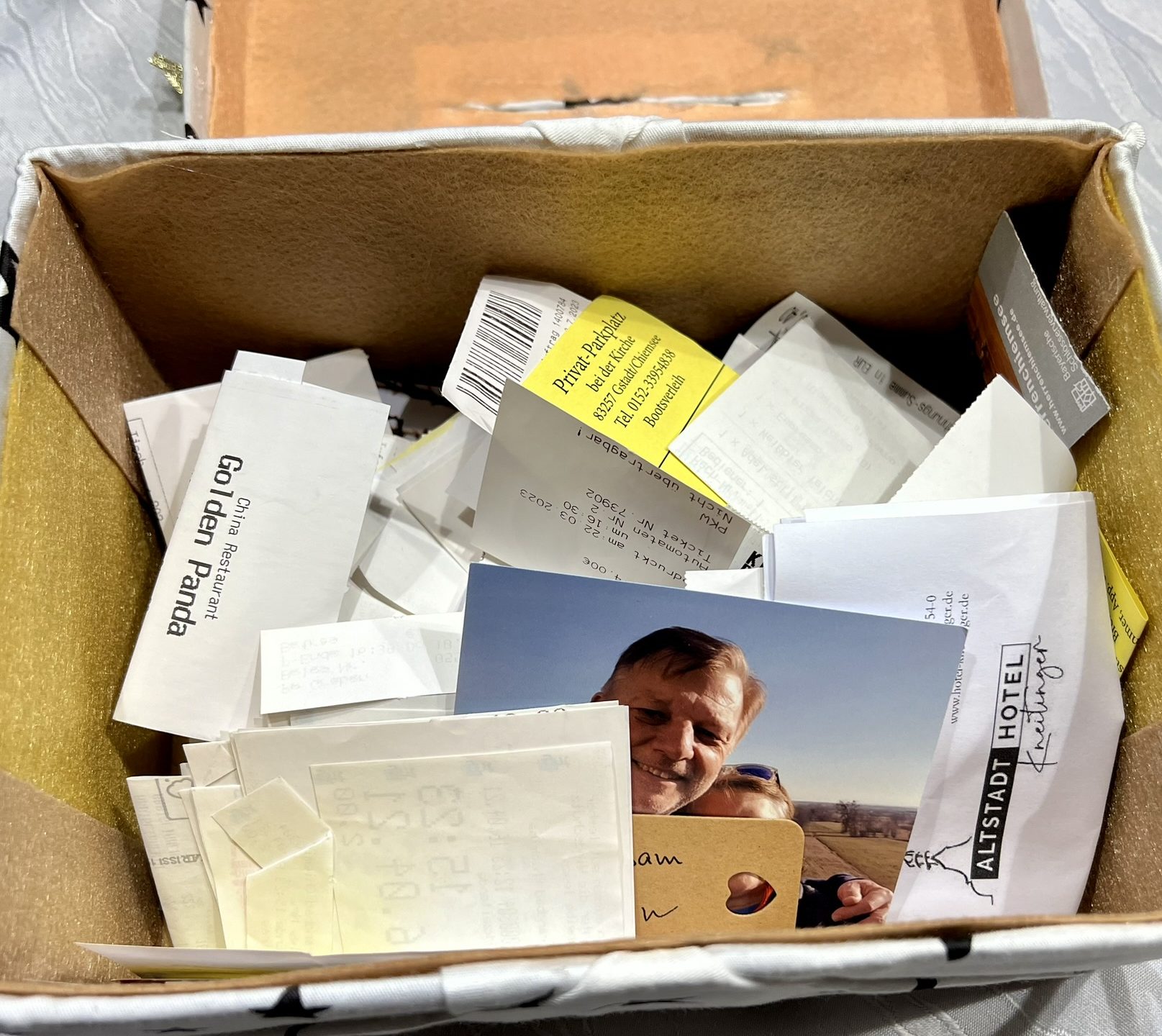Gemeinsam erlebte Momente, werden in Form von Erinnerungsstücken festgehalten, mit Datum versehen und in eine versiegelte Box gelegt (siehe unten). Das können Eintritts- oder Fahrkarten, Belege von gemeinsamen Abendessen, kleine Gegenstände, die uns an besondere Momente erinnern, gemachte Notizen über schöne Erlebnisse, aber auch Wünsche für das kommende Jahr sein, alles was wir so im Laufe eines Jahres gemeinsam erlebt haben. Nicht zu vergessen all die in der „Zeit statt Zeug“ Box verwendeten Momente.