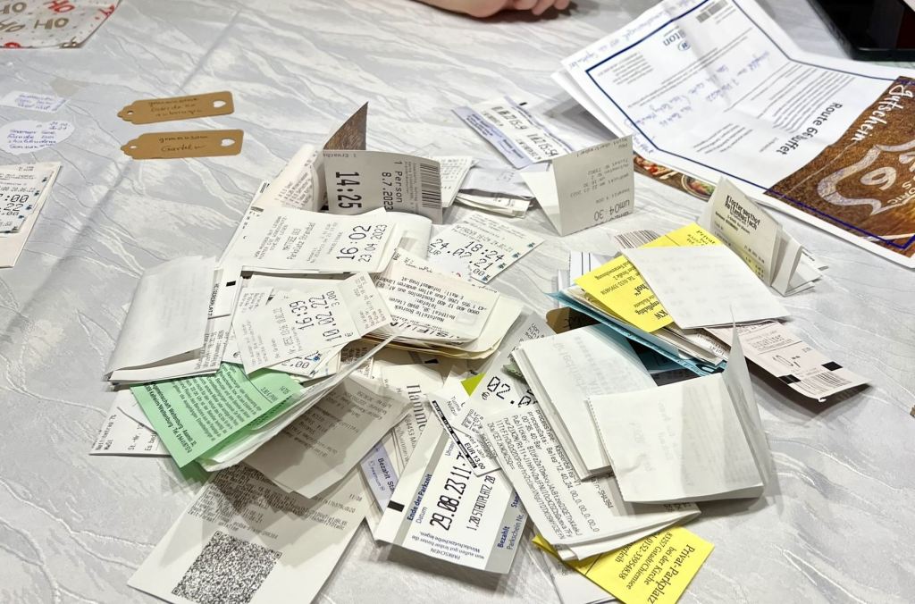Gemeinsam erlebte Momente, werden in Form von Erinnerungsstücken festgehalten, mit Datum versehen und in eine versiegelte Box gelegt (siehe unten). Das können Eintritts- oder Fahrkarten, Belege von gemeinsamen Abendessen, kleine Gegenstände, die uns an besondere Momente erinnern, gemachte Notizen über schöne Erlebnisse, aber auch Wünsche für das kommende Jahr sein, alles was wir so im Laufe eines Jahres gemeinsam erlebt haben. Nicht zu vergessen all die in der „Zeit statt Zeug“ Box verwendeten Momente.