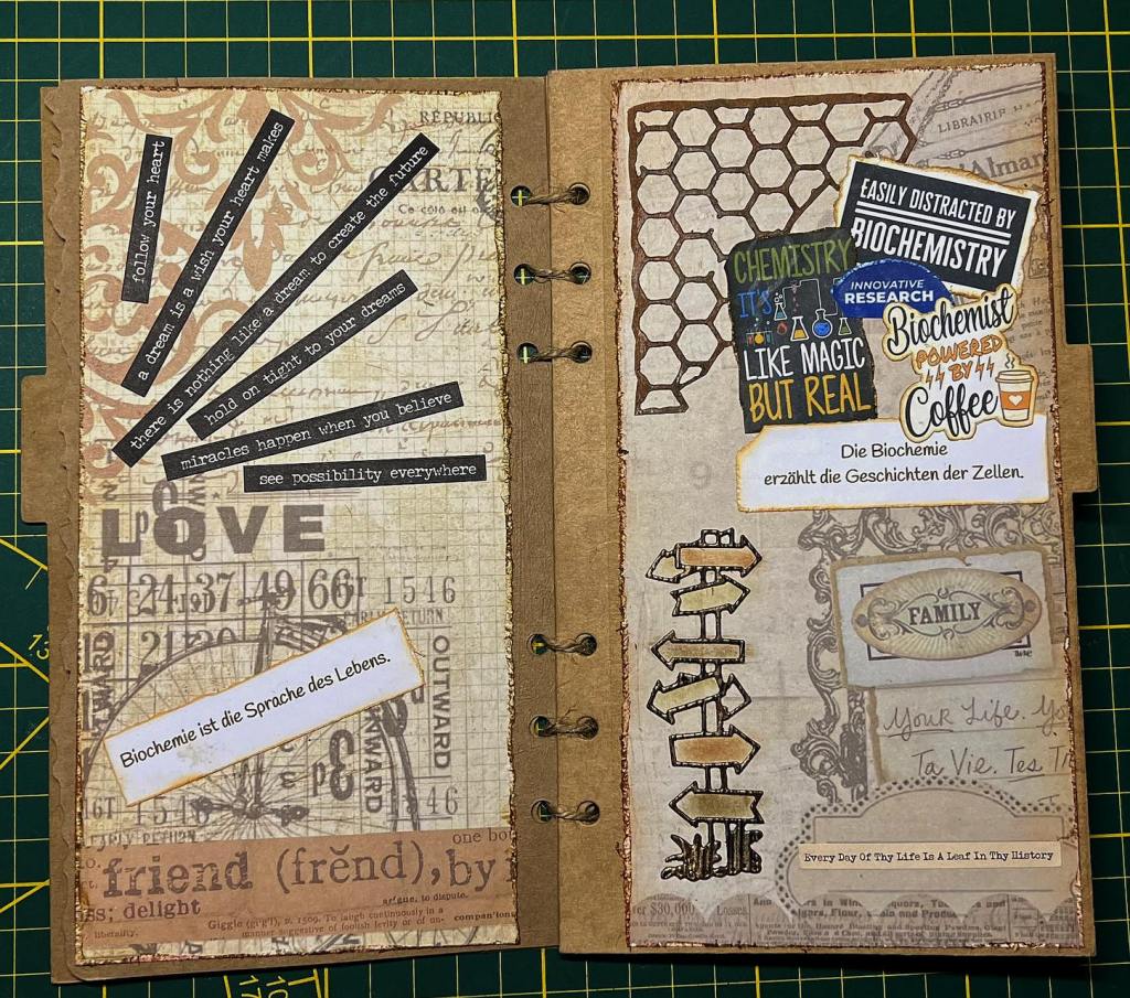 Dieses Scrapbook beinhaltet ganz viele selbst ausgestanzte und teilweise auch selbst eingefärbte Teile. Alles ist speziell angefertigt und sorgfältig zu einer kleinen Geschichte zusammengefügt – ganz nach meinem Motto